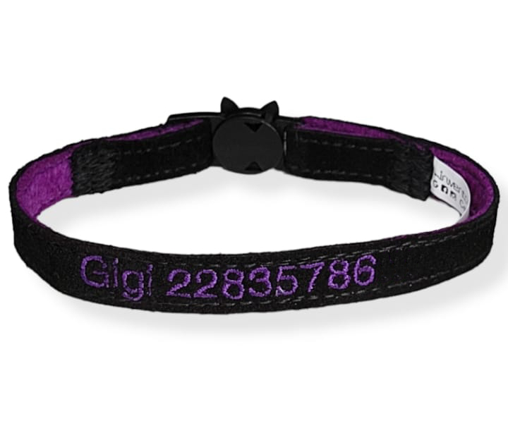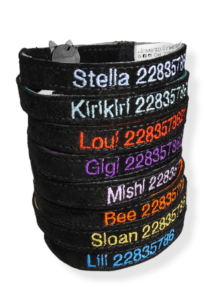 Protección para su mascota en un hermoso, útil y único collar identificador de gamuza real, personalizado con nombre de la mascota, número de contacto y broche especial que se zafa en caso de atoramiento.