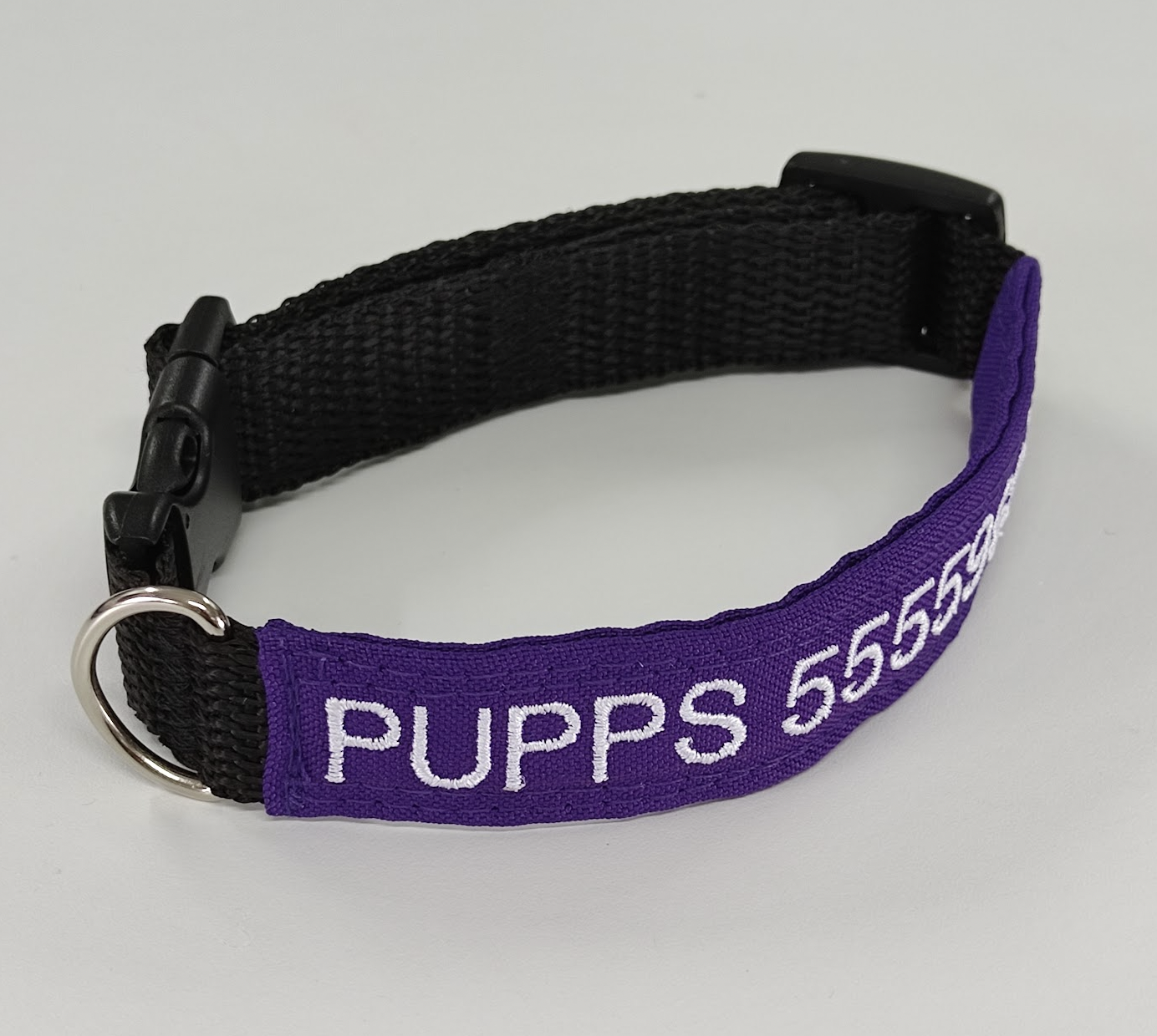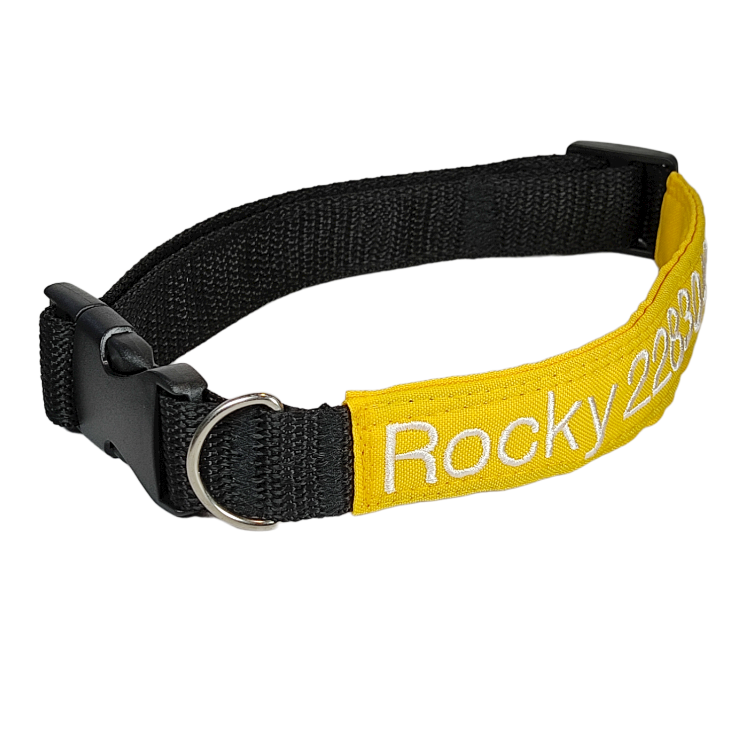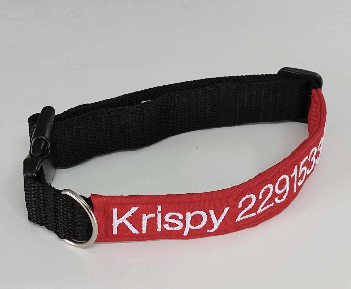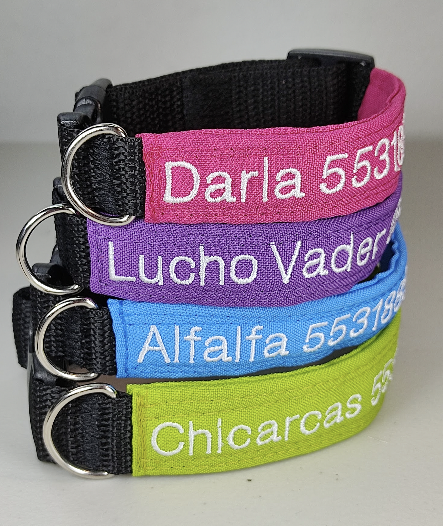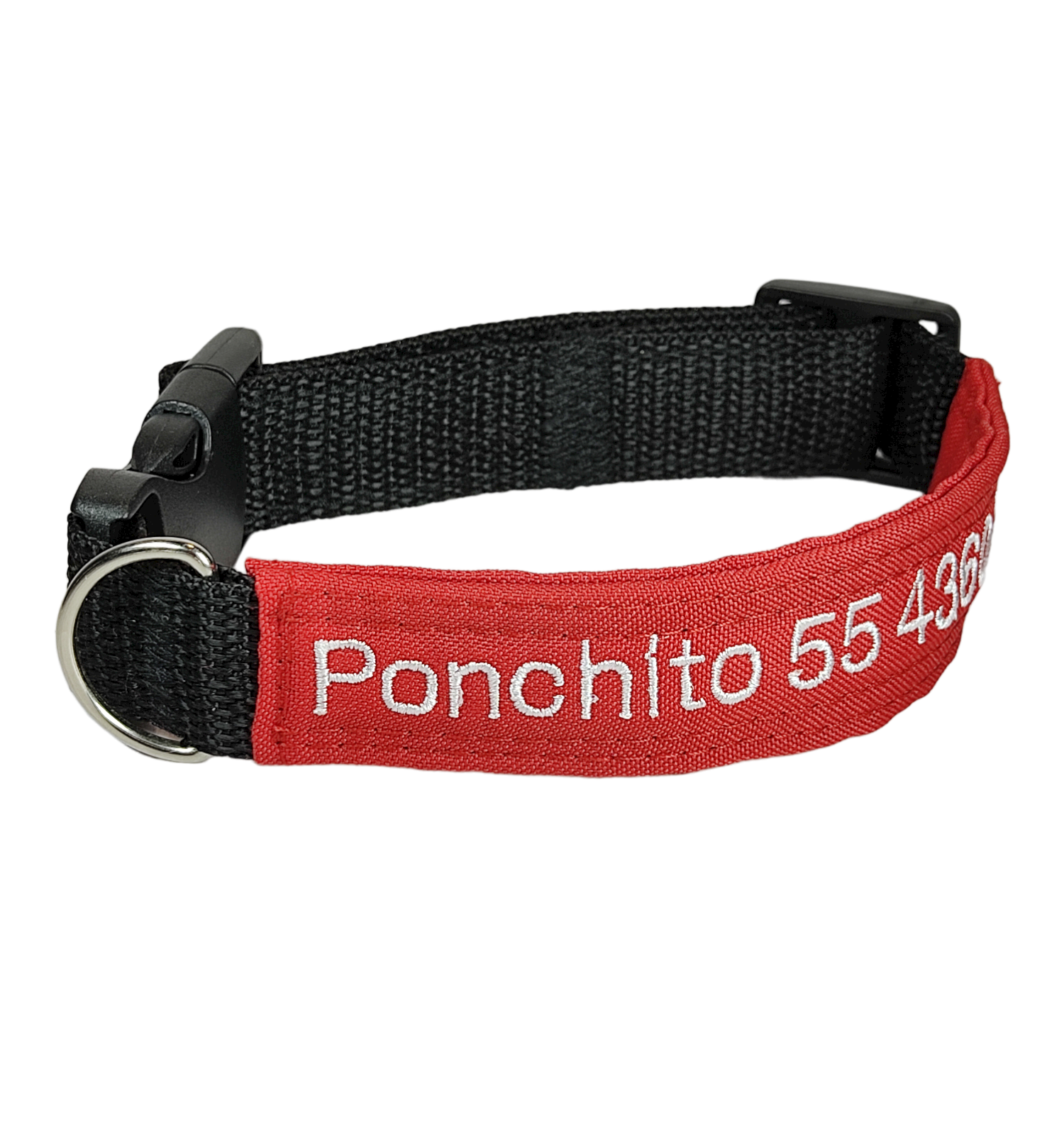 Protección para su mascota en un hermoso, útil y duradero collar identificador de tela personalizado con nombre de la mascota y número de contacto.