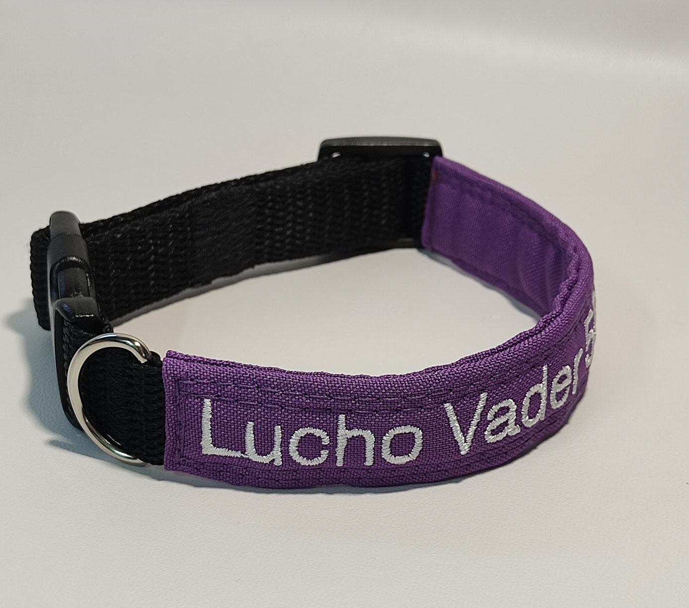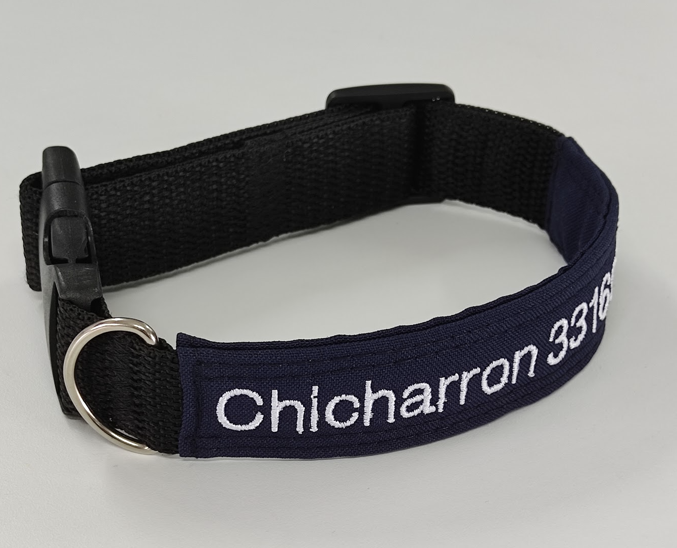 Hechos con cinta de polipropileno (de 2 o 2.5 cm de ancho según la talla) color negra, tela de color a elegir, bordado en color blanco, broche de acetal (material con buenas propiedades de desgaste, de mejor calidad que los de plástico), pasacintas de plástico negro y aro de metal en D reforzado. Se ajusta.