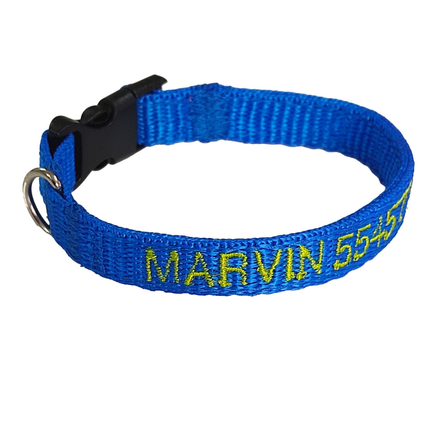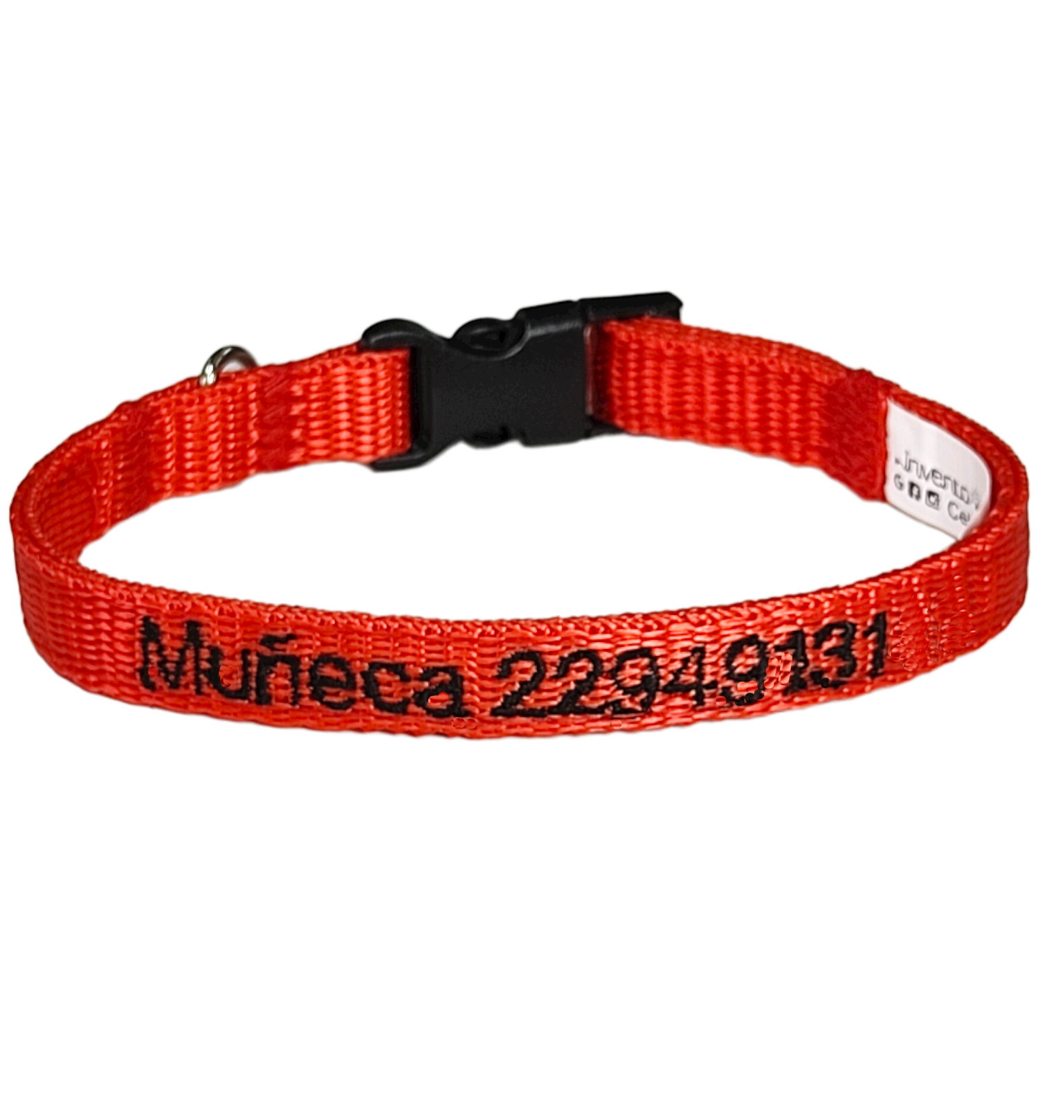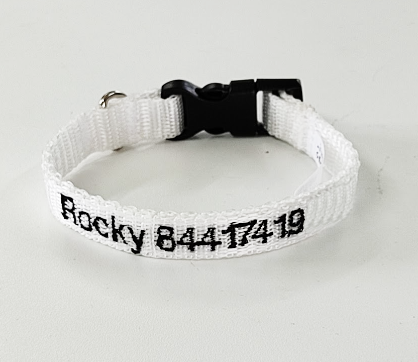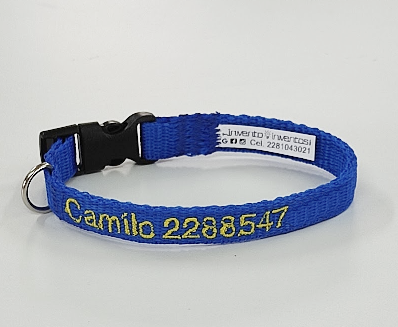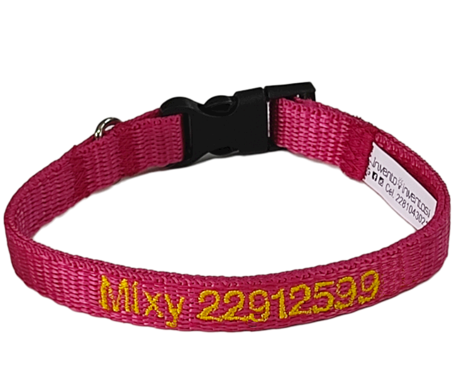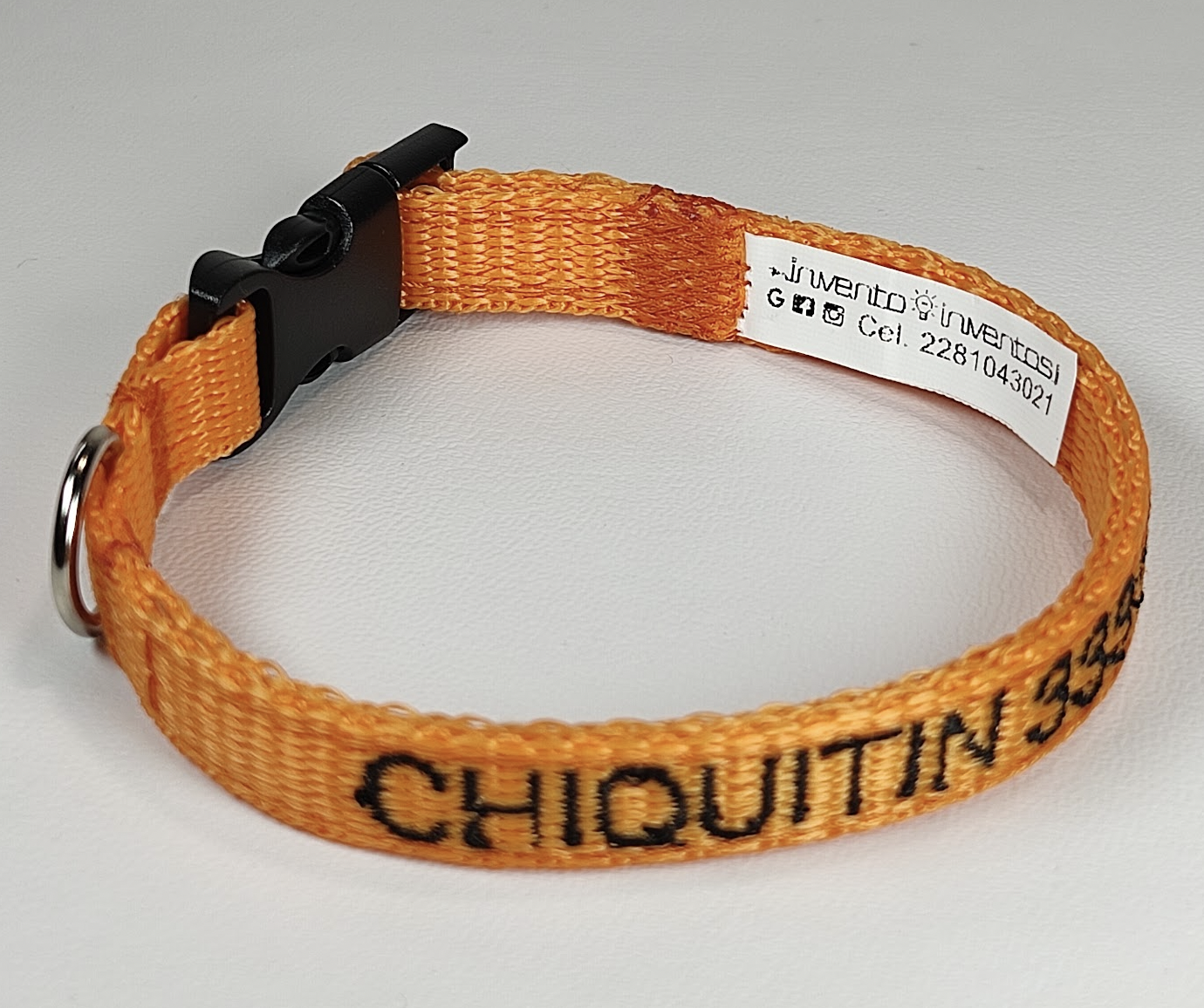 Protección para su mascota en un hermoso, útil y duradero collar identificador mini de cinta, personalizado con nombre de la mascota y número de contacto.
