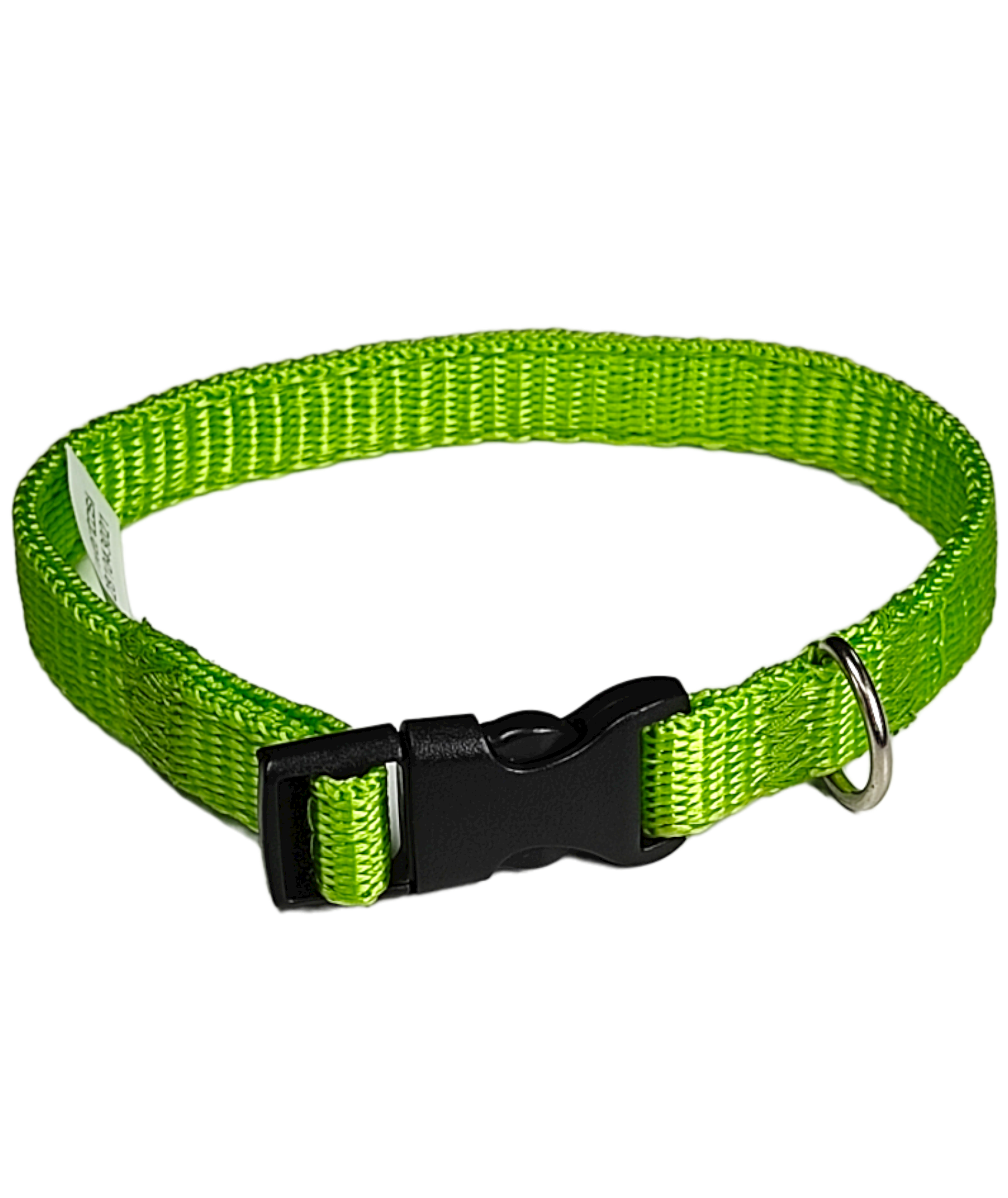 Hechos con cinta de polipropileno de 1 cm., broche de acetal (material con buenas propiedades de desgaste, de mejor calidad que los de plástico) y aro de metal en D. NO se ajusta. El collar por su naturaleza es muy pequeño, y el espacio para bordar no nos permite tener un área de ajuste.