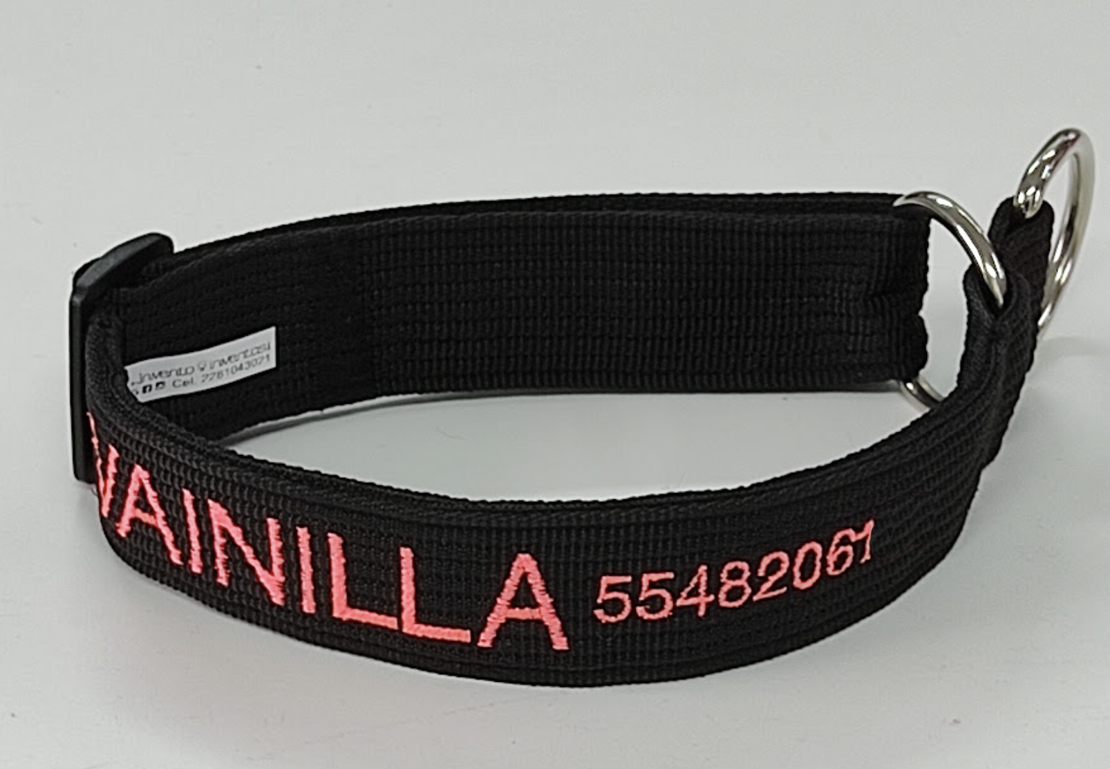 El color de la cinta en donde se bordarán los datos es únicamente NEGRA. La cinta que reforzará el collar también lo será.