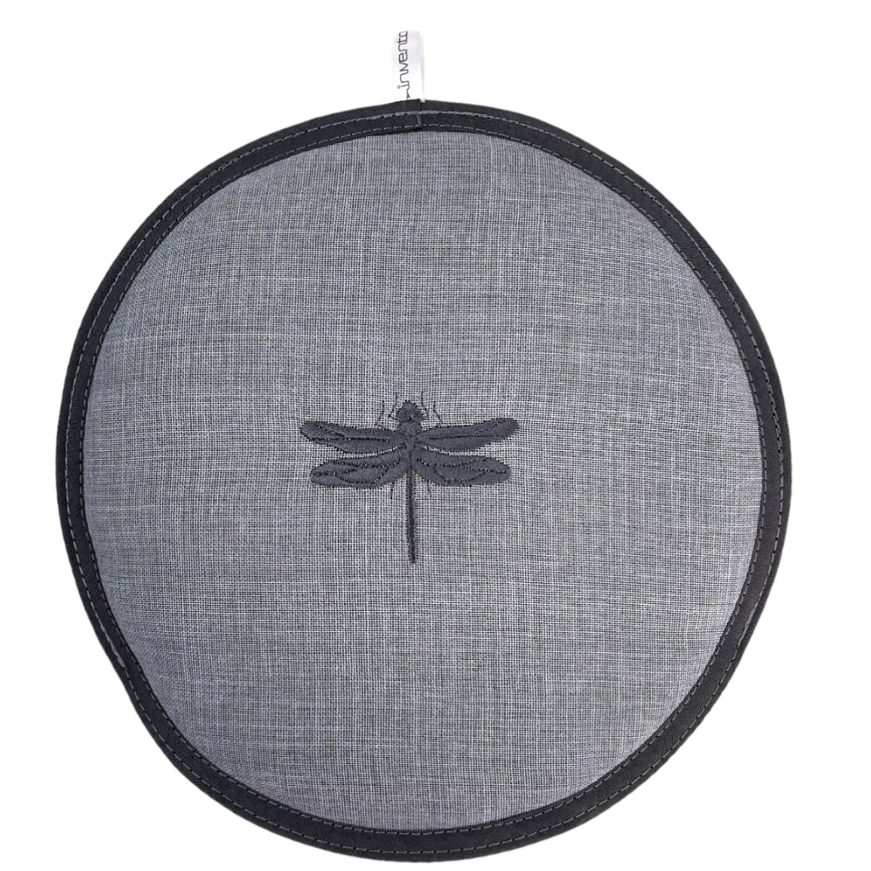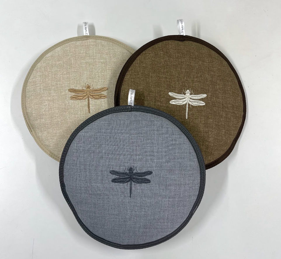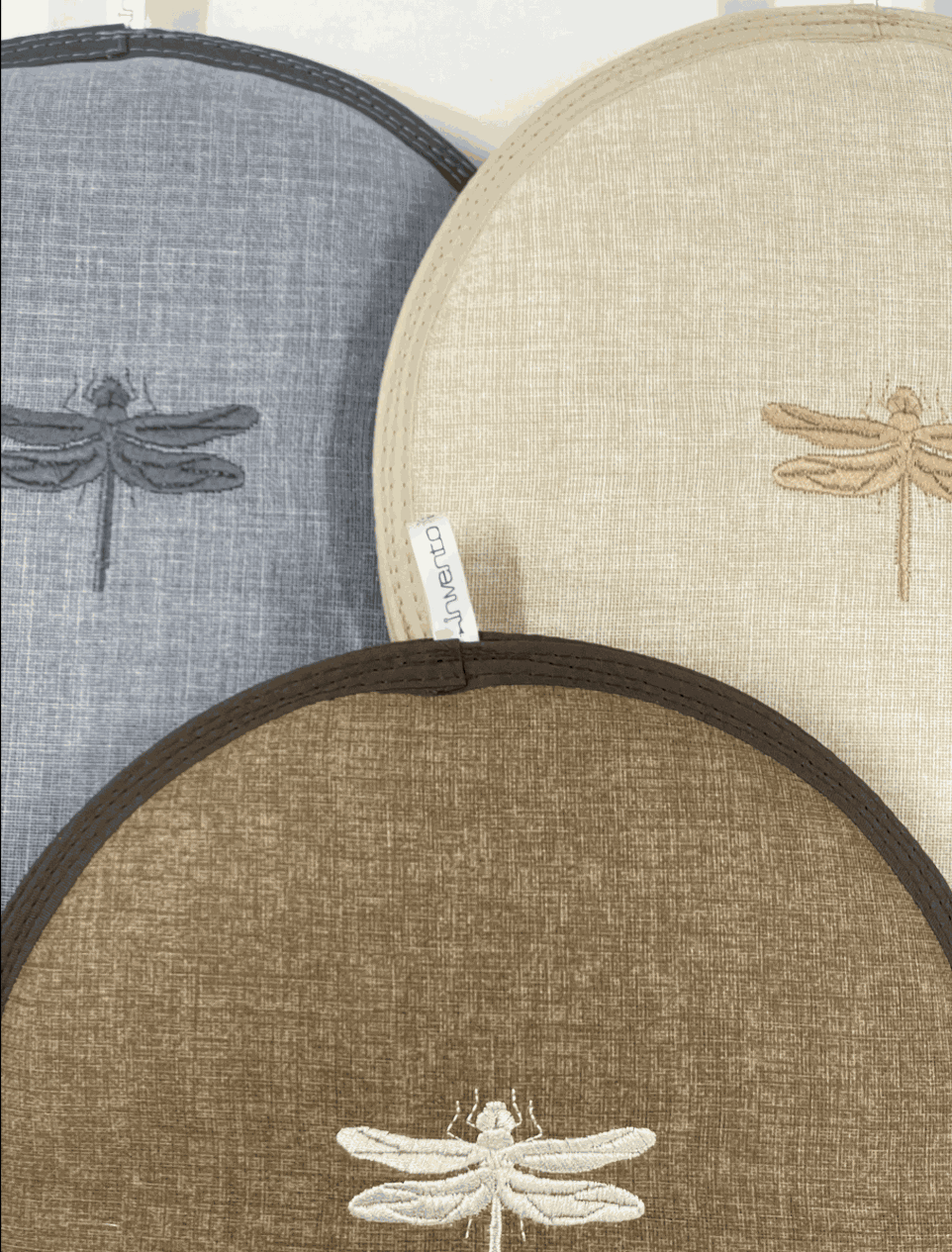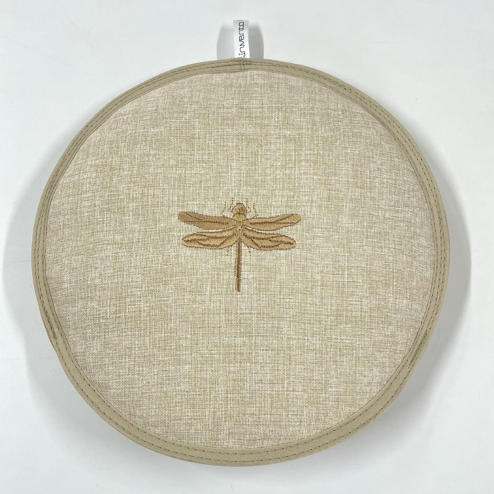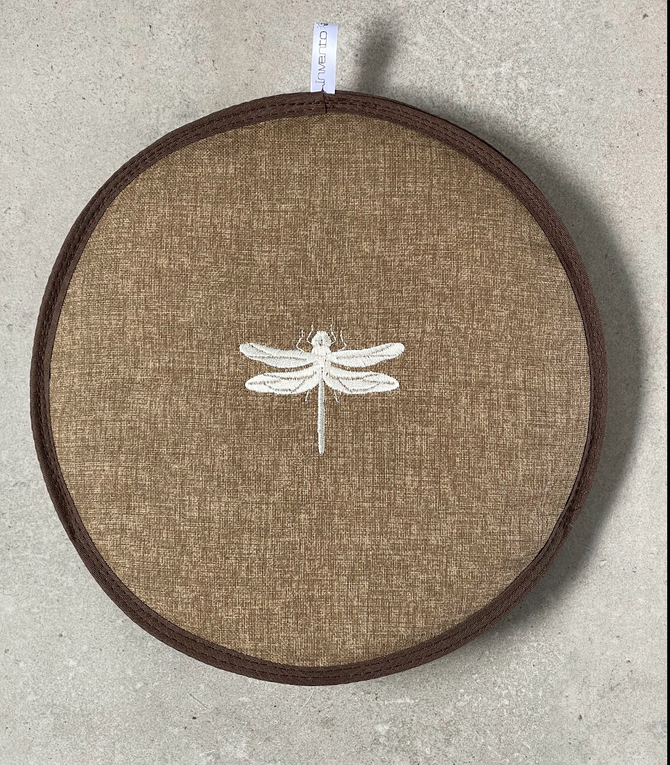 Hechos de tela tipo lino de alta calidad con microfibras aislantes en el interior, bies y tela interior de poliéster bordados con una libélula.